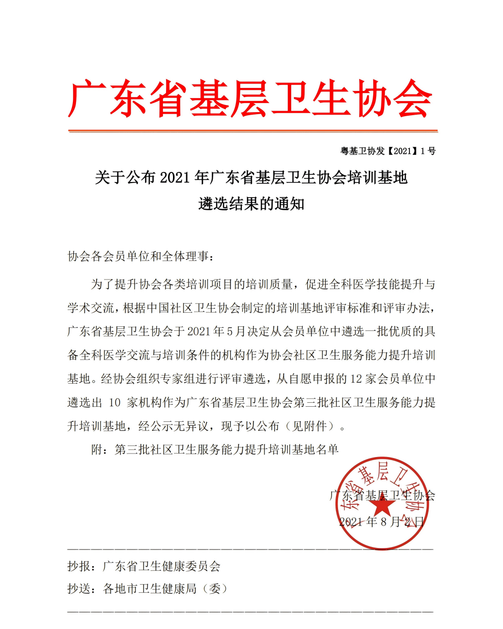 关于公布2021年广东省基层卫生协会培训基地遴选结果的通知(第三批)