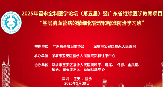 国庆节前夕的深圳,骄阳似火,热情洋溢。 2025年9月30日,福永全科医学论坛(第五届)暨广东省继续医学教育项目 “基层脑血管病的精细化管理和精准防治学习班",在深圳市宝安区福永人民医院成功举行。本次会议由广东省基层卫生协会、深圳市宝安区福永人民医院联合举办,深圳市宝安区福永人民医院新和社康中心承办,深圳市宝安区福永人民医院和平、塘尾、怀德、金凤凰、桥头、白石夏东区、新田7家社康中心协办。