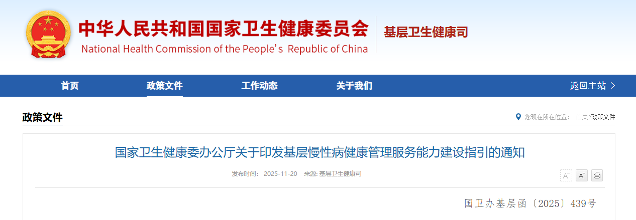 根据国家卫生健康委、国家发展改革委、财政部、国家医保局、国家中医药局、国家疾控局《关于加强基层慢性病健康管理服务的指导意见》(国卫基层发〔2025〕15号),乡镇卫生院和社区卫生服务中心通过功能整合,可设立分区合理、动线流畅的“一站式”基层慢性病健康管理中心。为指导各地根据需要促进基层慢性病健康管理服务能力建设,优化服务流程,提高服务质量,适应城乡居民慢性病健康管理服务需求,我委制定了《基层慢性病健康管理服务能力建设指引》,现印发给你们,请结合实际参照执行。