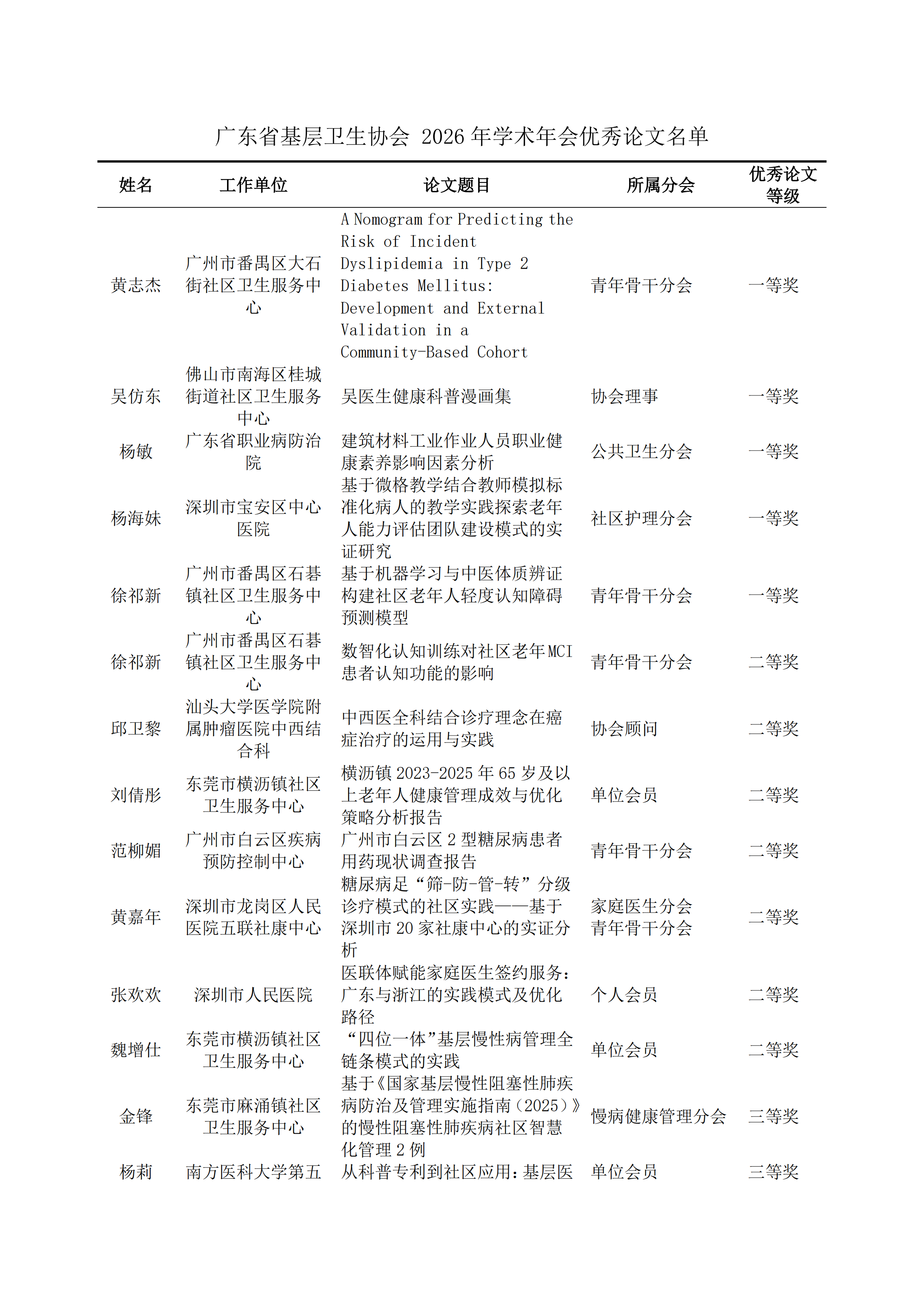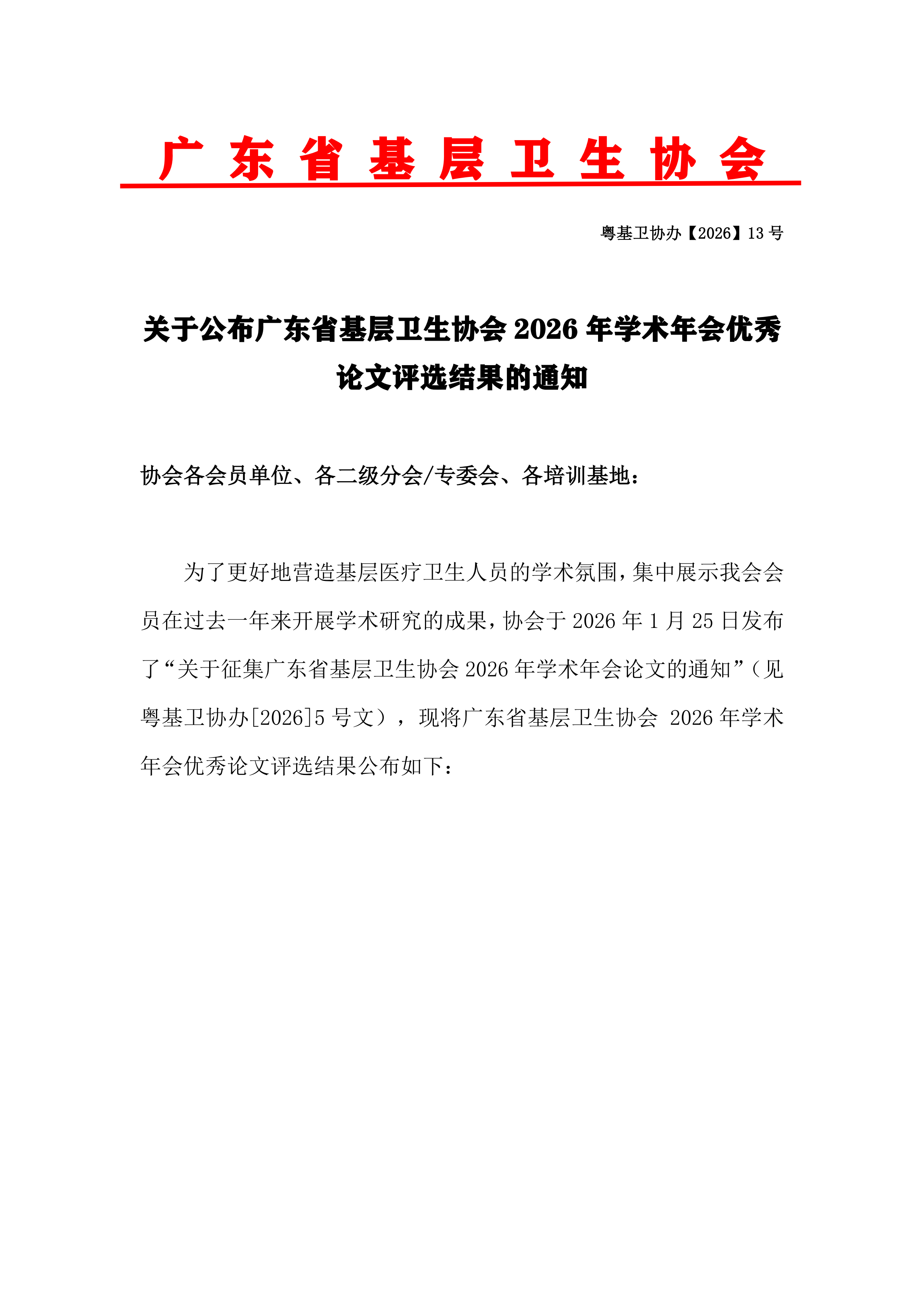 关于公布广东省基层卫生协会2026年学术年会优秀论文评选结果的通知